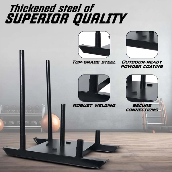 Built with durable heavy-duty steel, the sled is designed to withstand intense training sessions. Its versatile design allows you to perform both sled pulls and sled pushes, making it ideal for developing leg power, speed, core stability, and cardiovascular endurance. Simply load weight plates onto the center post and attach a harness or rope to start your training.